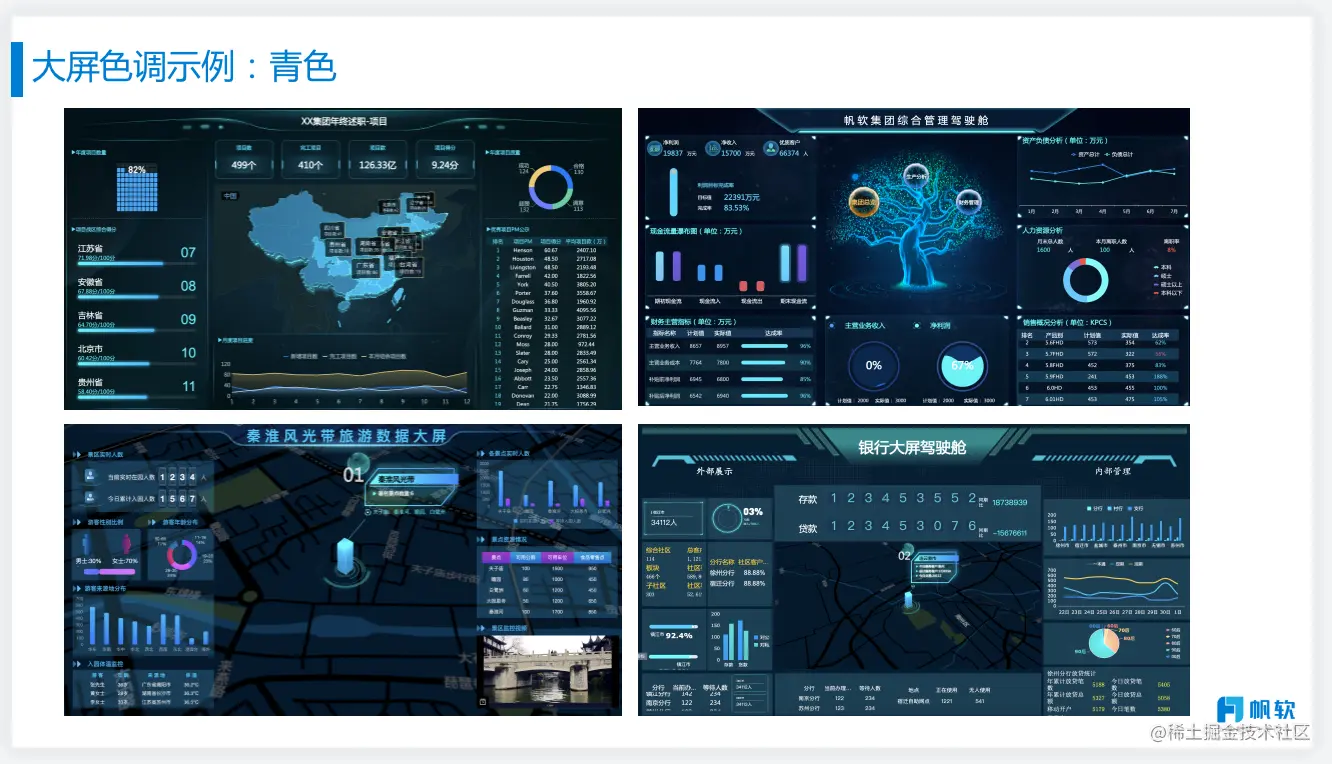 对于大屏主色调的选择,我们最常用的是蓝色系,其次是青色,再次是红、黄、绿等偏亮的颜色,其他色系并非不可用,但对新手而言是很难把控的。