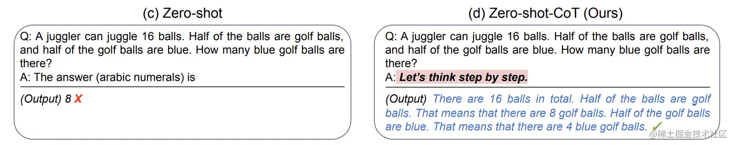 这个技巧使用起来非常简单,只需要在问题的结尾里放一句 Let‘s think step by step (让我们一步步地思考),模型输出的答案会更加准确。