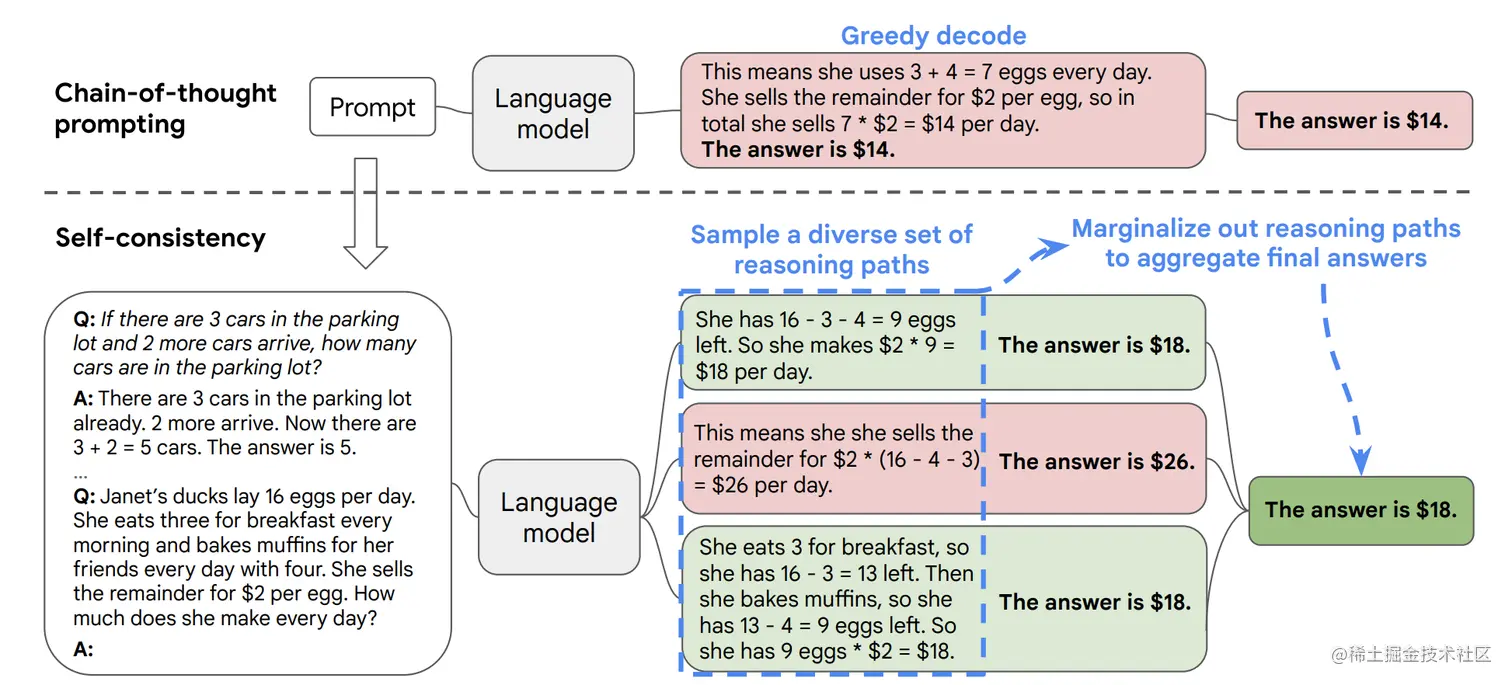 Self-consistency 从生成的多个推理路径中选择最一致的答案。在这个例子中,推理路径 A 和 B 都得出相同的答案(8 个水果)。可以看到这种做法增加了模型对最终答案正确的信心。