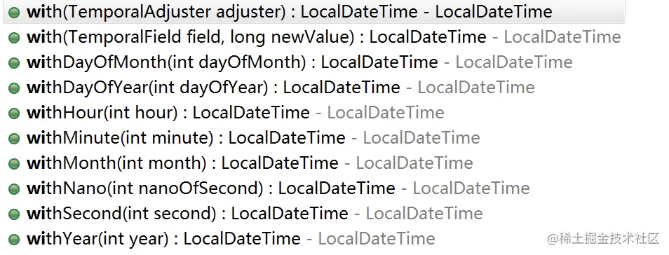 我们除了可以进行日期和时间的增加、减少操作之外,还可以利用withXxx()方法对日期和时间进行调整,这些方法如下图所示: