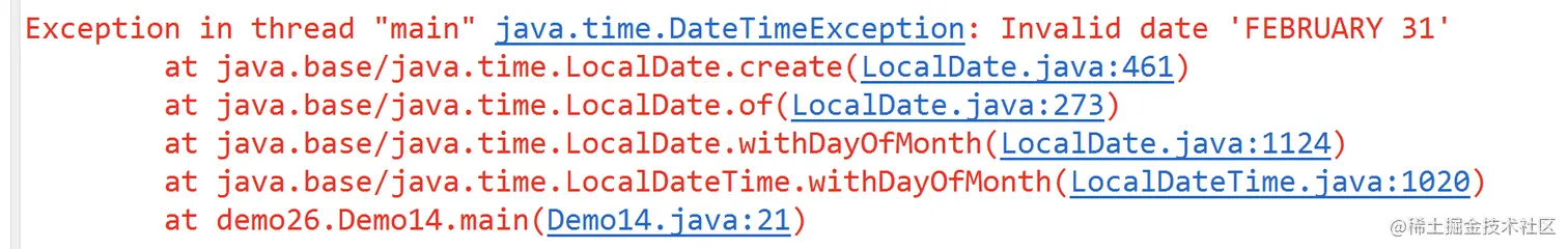 // 注意:如果某个月中没有29、30、31等日期,会出现java.time.DateTimeException: Invalid date 'FEBRUARY 31'类似的异常。