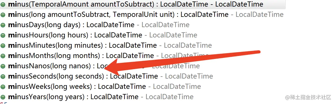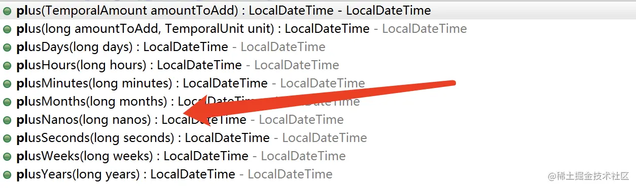 在LocalDateTime中,给我们提供了一系列的加减操作方法,使得我们可以很轻易的实现时间的加减操作,比如给某个日期或时间进行加或减的操作。plusXxx()增加方法如下图所示: