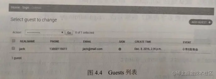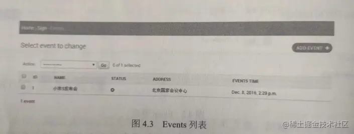 如图4.2所示,显示的是一条发布会信息,默认只有发布会名称,这与创建model时设置的_str_()方法有关,默认返回self.name,即发布会名称。