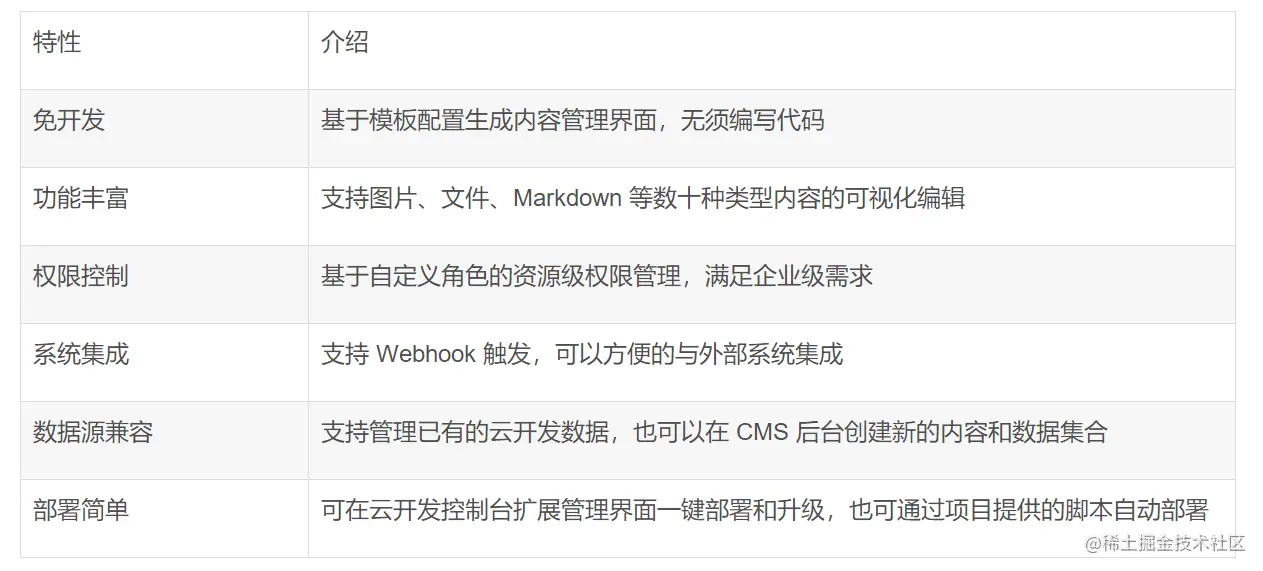 CloudBase CMS 是云开发推出的,基于 Node.js 的 Headless 内容管理平台,提供了丰富的内容管理功能。