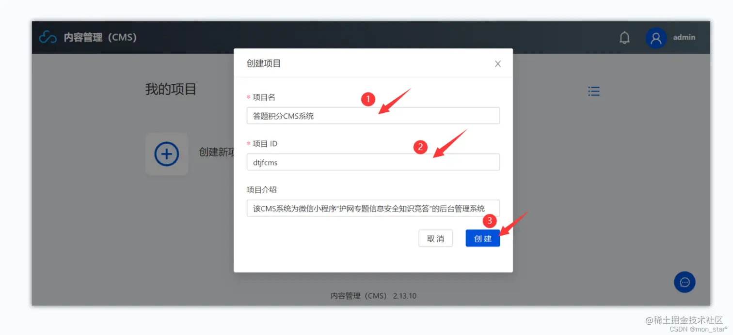 然后填写项目名、项目ID等,点击【创建】按钮,创建一个名为“答题积分CMS系统”,ID 为 “dtjfcms” 的项目;