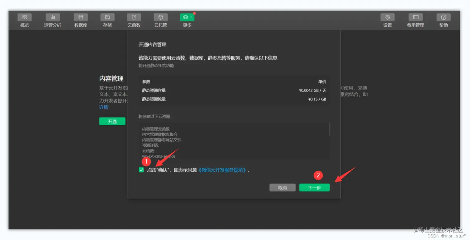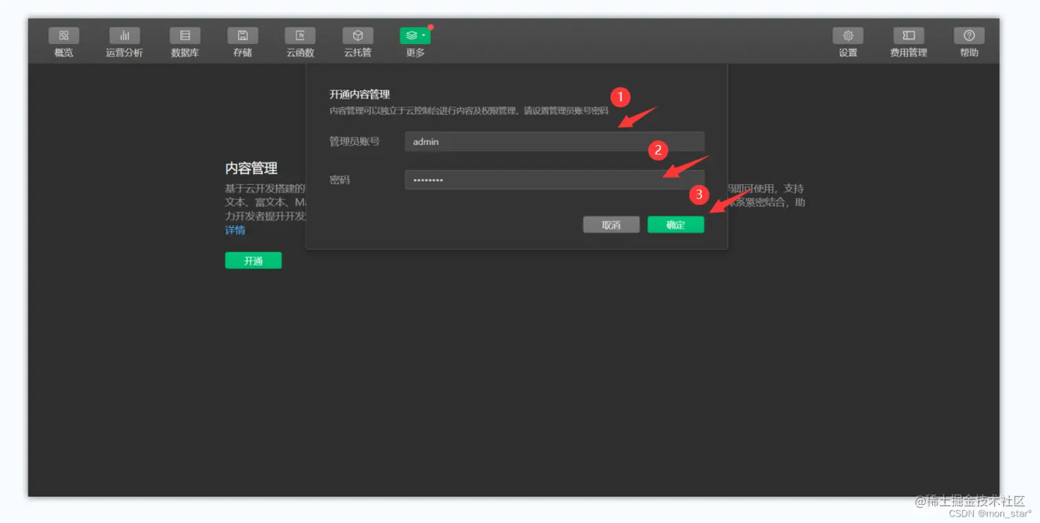 因为内容管理服务是独立于云开发控制台进行内容及权限的管理,所以需要填写管理员账号及密码用于登录内容管理服务平台;