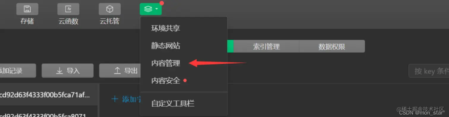 在答题小程序的【云开发控制台】,点击【更多】-【内容管理】;
