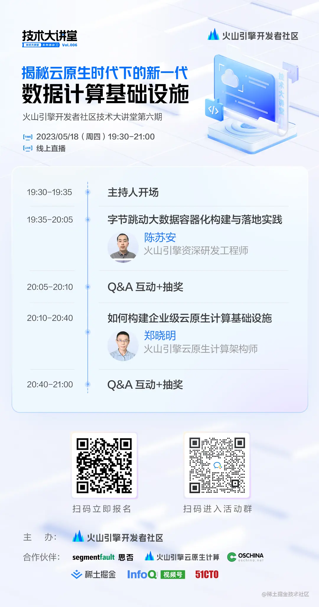 5 月 18 日,火山引擎开发者社区技术大讲堂第六期邀请到了来自火山引擎的 2 位技术专家,将从字节跳动大数据容器化构建实战、云原生大数据解决方案等角度,为大家带来干货分享,帮你全面了解字节跳动云原生大数据实践经验与避坑指南,揭秘云原生时代下的新一代数据计算基础设施。精彩不容错过,快来喊上小伙伴们报名观看直播吧!