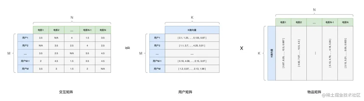 在用户矩阵与物品矩阵中,K 是超参数,它是由开发者人为设定的。不难发现,对于用户矩阵 U 中的每一行, 都可以看作是用户的 Embedding,也即刻画用户的特征向量。同理,物品矩阵中的每一列,也都可以看作是物品的 Embedding,也即刻画物品的特征向量。