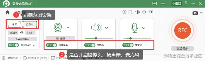 步骤3: 设置录制的内容和区域、根据需要确认摄像头、麦克风、扬声器的状态,点击【REC】录制。