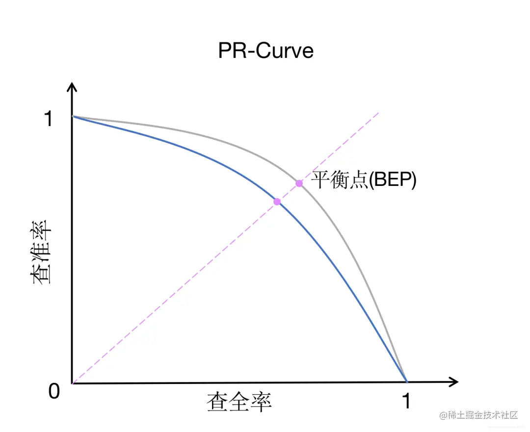 - PR曲线:横坐标为召回率Recall,纵坐标为精准率Precision,PR曲线完全聚焦为正例。
