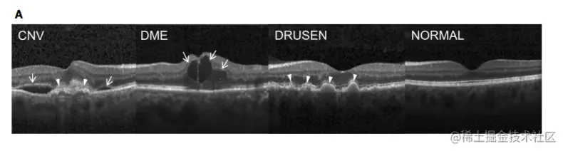 Retinal OCT包含84,495张X光图像,其中包含CNV、DME、DRUSEN和NORMAL四种类别,其中每一个都与其他存在细微的差别。是医学图像异常检测任务中的一个常用数据集。