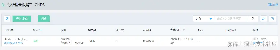 1、在京东云创建ClickHouse非常简单,用户在控制台“云服务”->“数据库与缓存”下选择“分析型云数据库JCHDB”进入实例列表界面,点击“创建”按钮,进入下面界面: