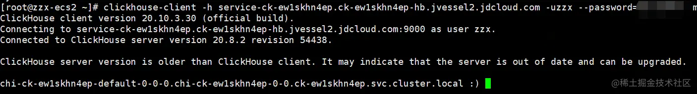(2)云主机上使用clickhouse-client命令连接到数据库,hostname和端口参考实例信息:
