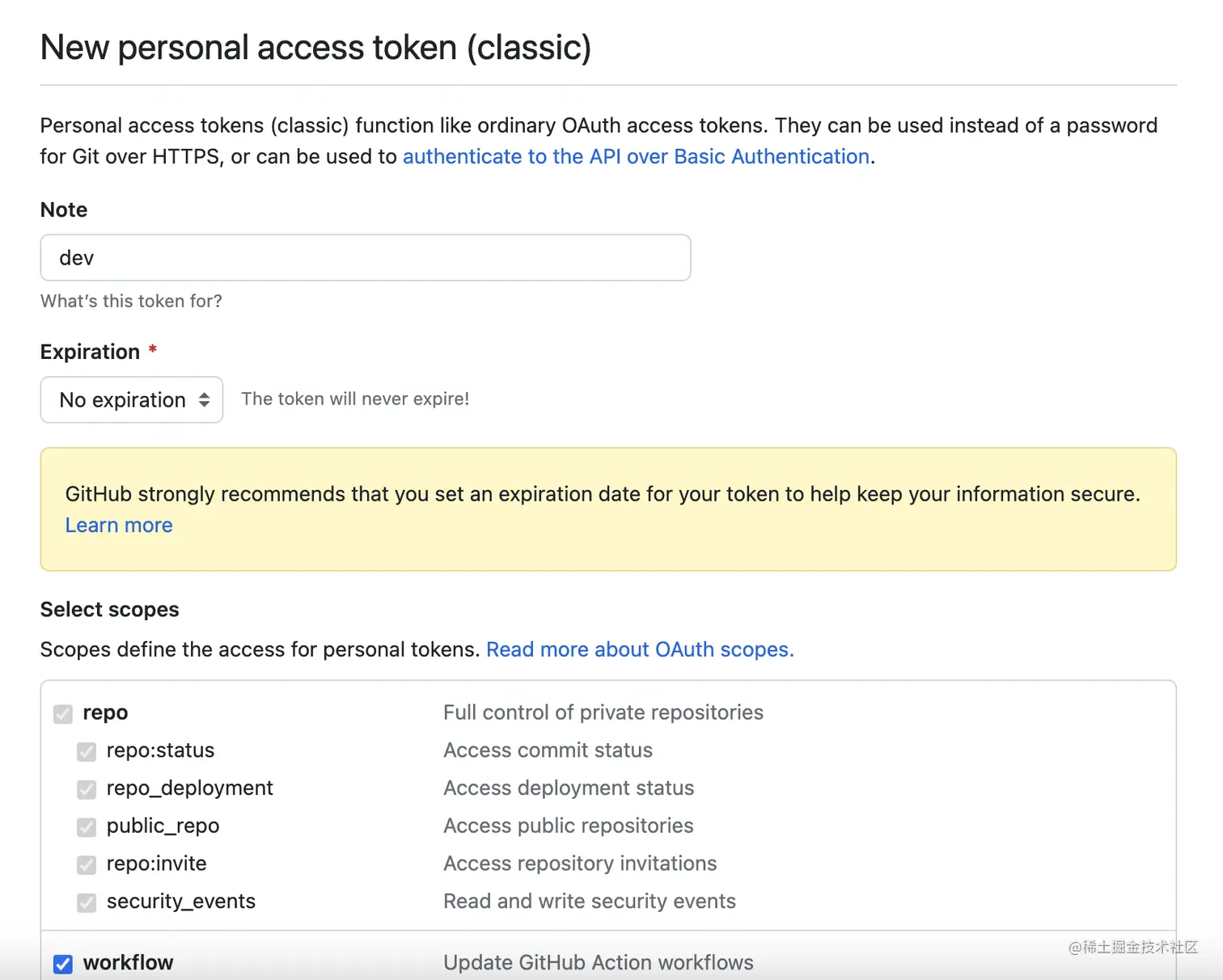 填写配置信息,token权限范围、过期时间等,然后 Generate token 生成token即可