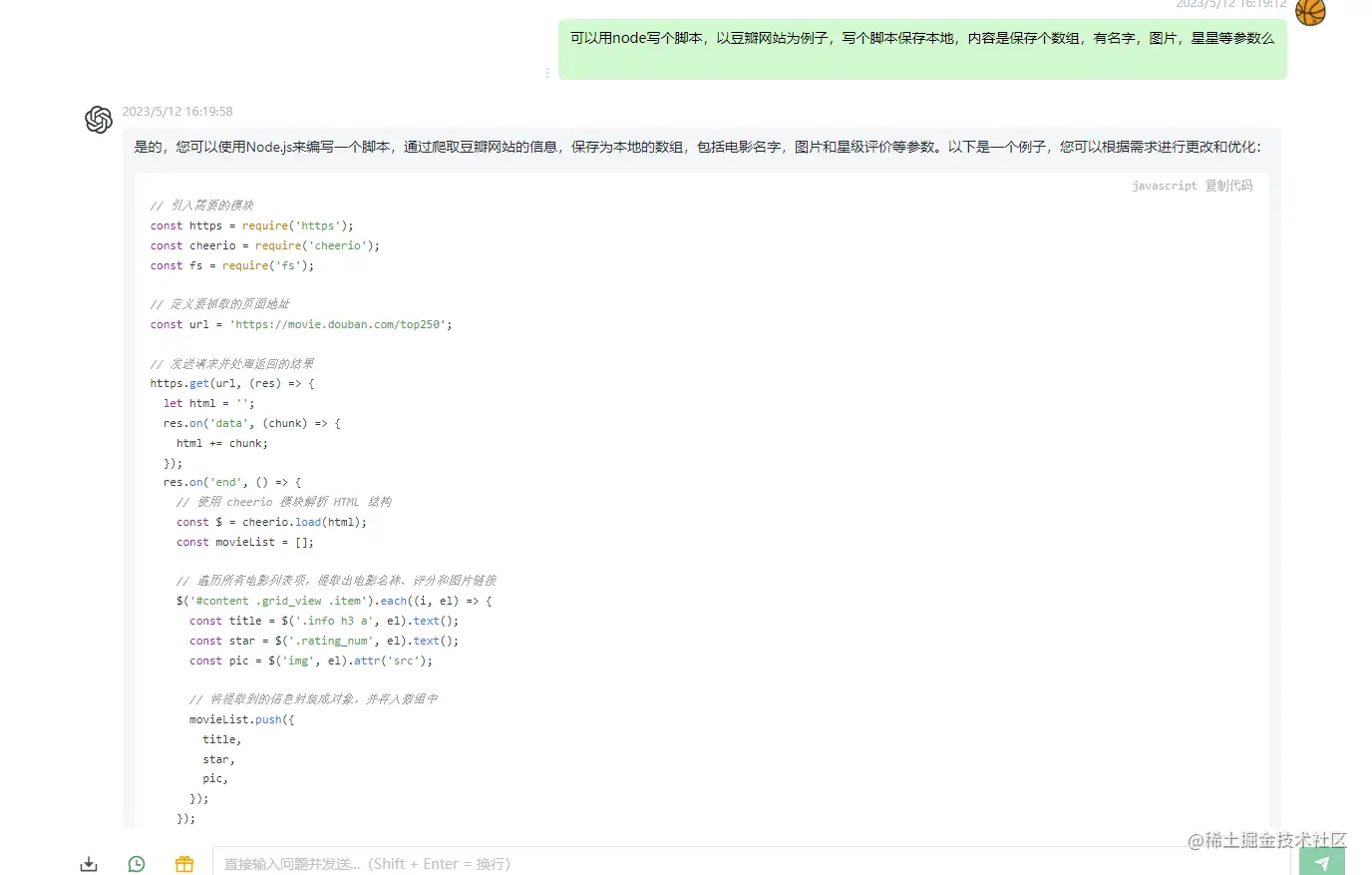 我用chatgpt爬虫,真的惊艳到我了 A赵先森专 2023-05-12 103 阅读1分钟 就用chatgpt发送了这一段,然后拿下面这些代码执行,下面是执行的 结果成功返回,真滴c啊 我用的我朋友公司的地址,免墙的免费,挺好用 chat.ai996.vip
