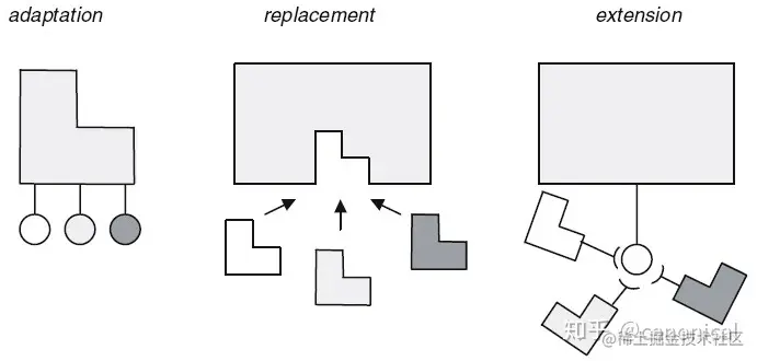 这三种方式都可以看作是向核心架构补充功能。但是可复用性的障碍不仅仅是来自于无法追加新的功能,很多时候也在于无法屏蔽原先已经存在的功能。传统的适配技术等要求接口一致匹配,是一种刚性的对接要求,一旦失配必将导致不断向上传导应力,最终只能通过整体更换组件来解决问题。可逆计算通过差量合并为可变性管理补充了“消除”这一关键性机制,可以按需在领域模型空间中构建出柔性适配接口,从而有效的控制变化点影响范围。 可逆计算中的差量虽然也可以被解释为对基础模型的一种扩展,但是它与插件扩展技术之间还是存在着明显的区别。在平台-插件这样的结构中,平台是最核心的主体,插件依附于平台而存在,更像是一种补丁机制,在概念层面上是相对次要的部分。而在可逆计算中,通过一些形式上的变换,我们可以得到一个对称性更高的公式: