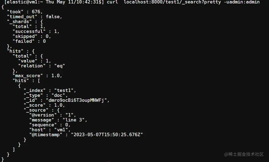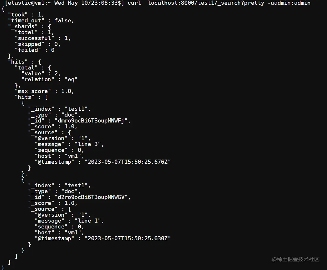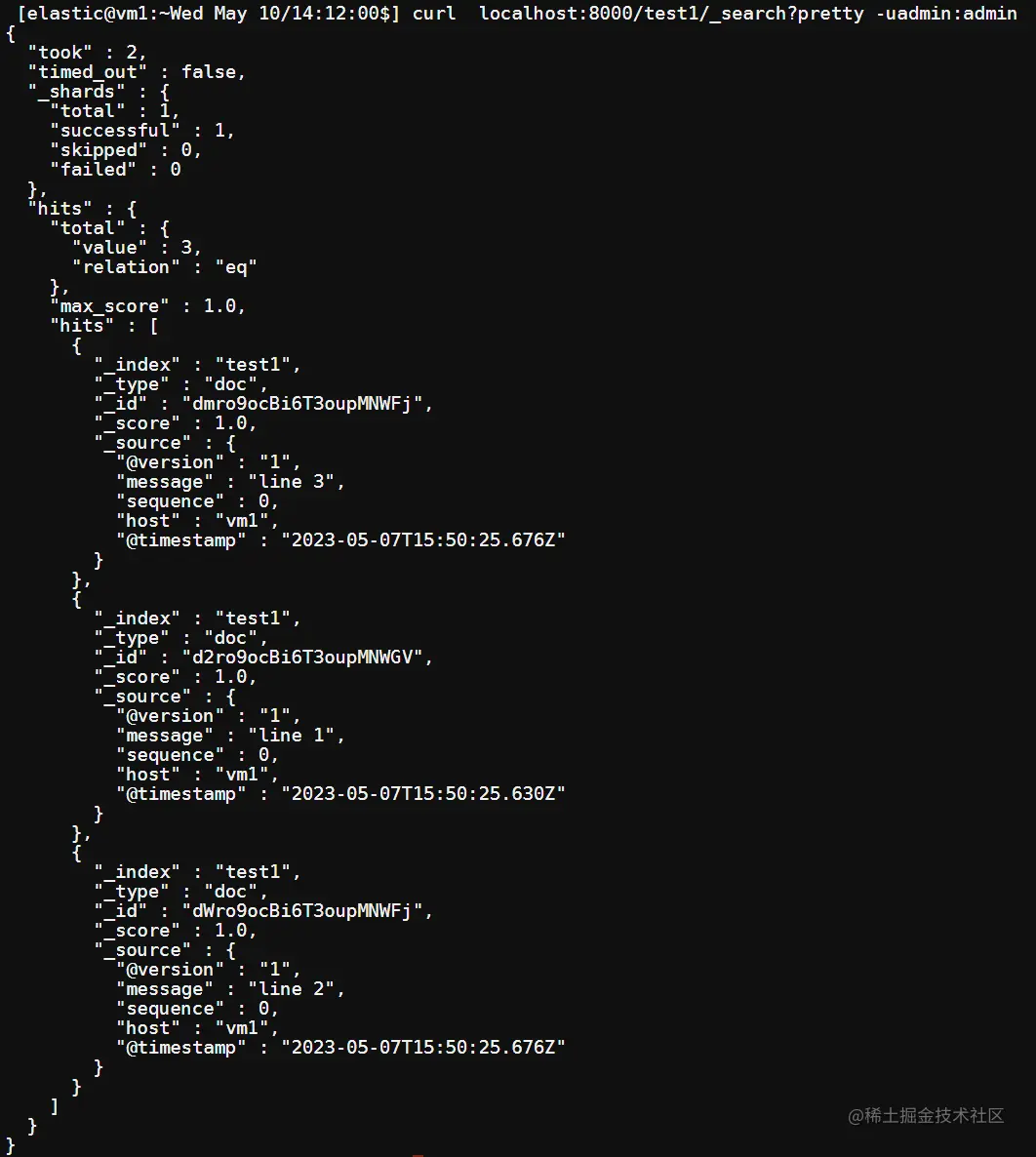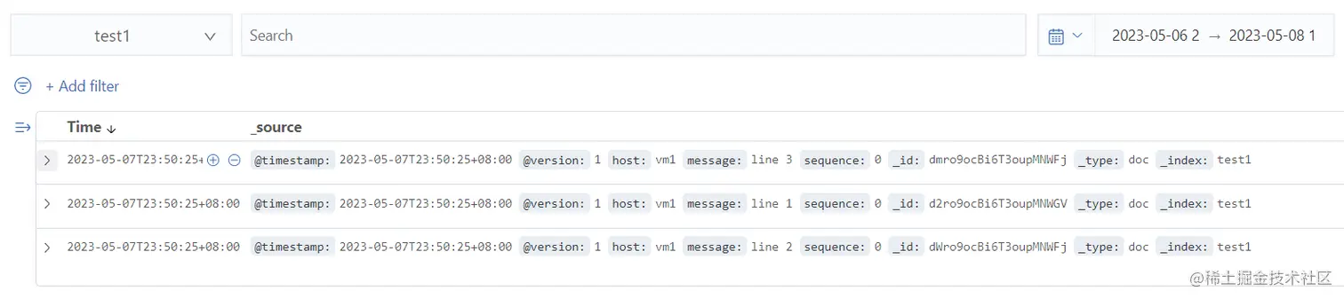 测试索引 test1,一共有 3 条数据。message 内容分别是"line 1","line 2"和"line 3"。