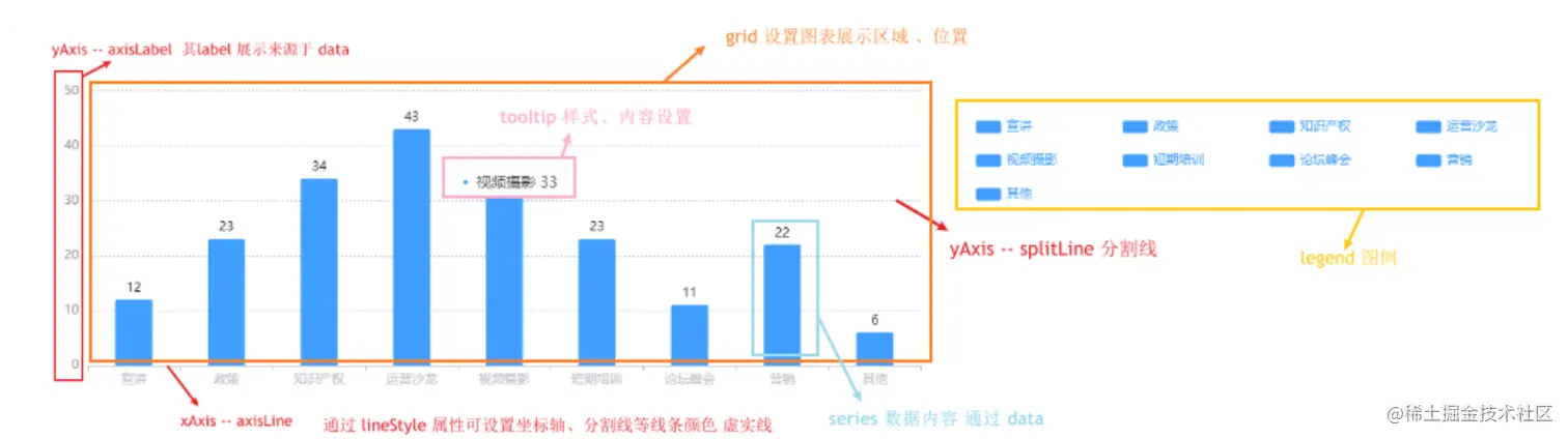 首先来熟悉一下 echarts 各个部分的配置项
