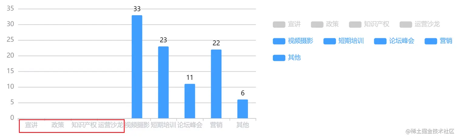 由于本次实现的是分类情况下的柱状图,每个柱状数据相互独立,并通过 legend 设置 该类目的隐藏与展示(该效果包括坐标轴上的类目也需要一起取消)。