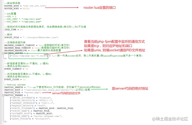 主要配置的有路由服务器地址(上面router设置的端口和地址),后端服务器列表的“BACKEND_SERVER”,以及fastcgi params,配置标注如下。