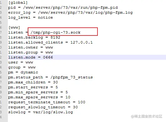 找到并打开php-fpm.conf文件,可以看到监听的通信方法以及通信的具体地址,还有fpm的错误日志存放地址。宝塔Nginx与fpm默认是以unix socket方法,如果fpm修改成了tcp,那nginx也要修改。