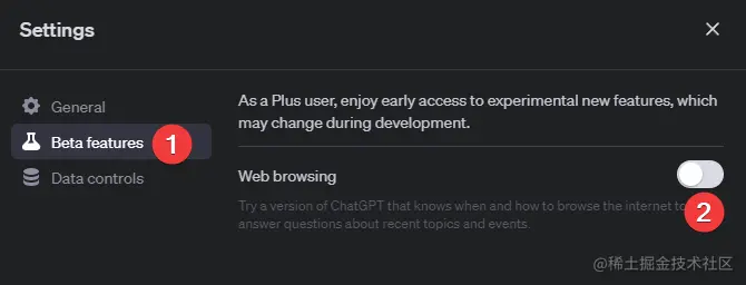 切换到“Beta features”选项,然后打开“Web Browsing”