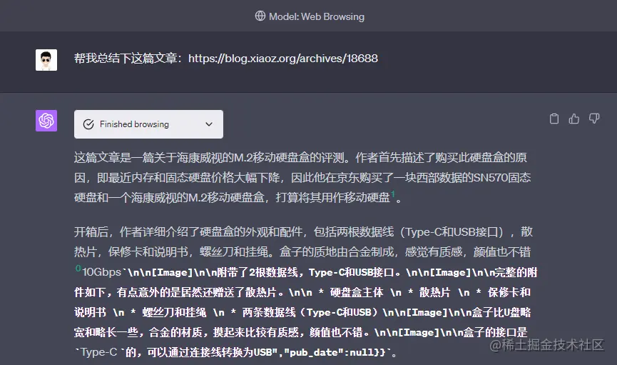 博主亲测测试了下,提供一个博客地址给ChatGPT让他帮我总结,确实能够联网读取内容,但是速度比较慢,而且输出的内容格式有点乱,希望后续不断改进提高速度和排版。