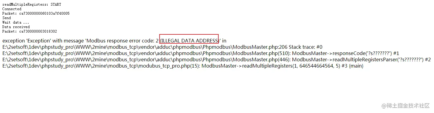 从机设备上数据的内容地址不对,可以根据slave的definition的参数,报错可以查看ModbusMaster类的responseCode方法。