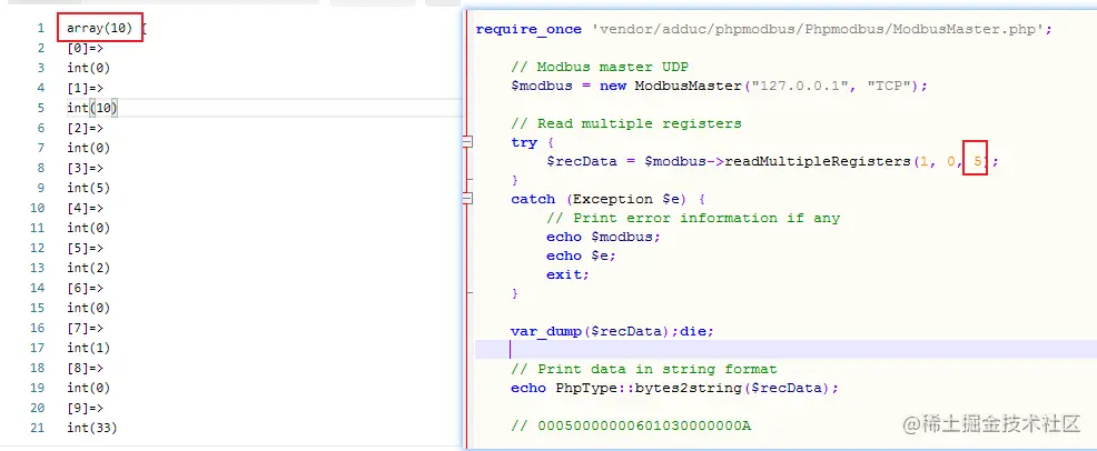 如果请求的是5个数据,phpmodbus会返回元素为10的数组。如果是2个,则返回4个元素数组,以此类推。