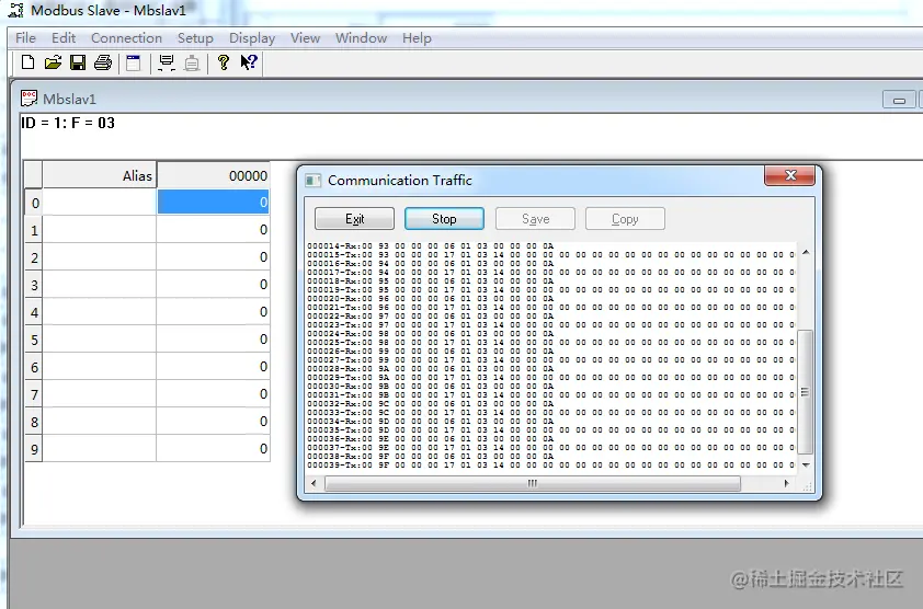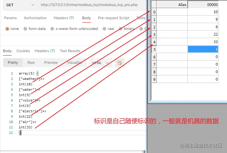 5. 运行成功后,返回数据,数组的索引需要计算匹配modbus slave的地址名