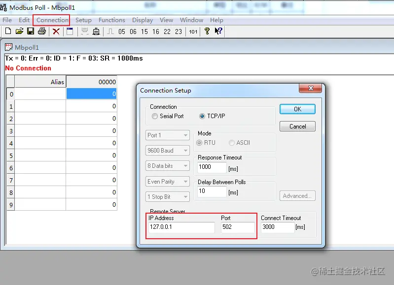 (1). 连接,点击connection->connection, 选择TCP/IP。