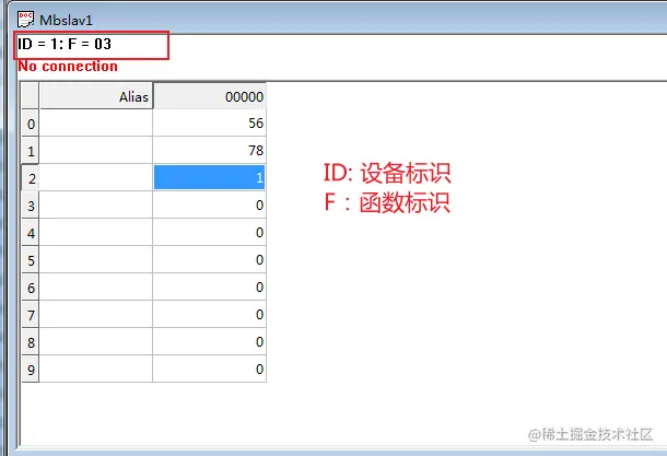 Tx = 4表示向主站发送数据帧次数,图中为4次; Error = 0表示通讯错误次数,图中为0次; ID = 1表示模拟的Modbus子设备的设备地址,图中地址为1;F = 03表示所使用的Modbus功能码,图中为03功能码; SR = 1000ms表示扫描周期。红字部分,表示当前的错误状态,“No Connection”表示未连接状态。