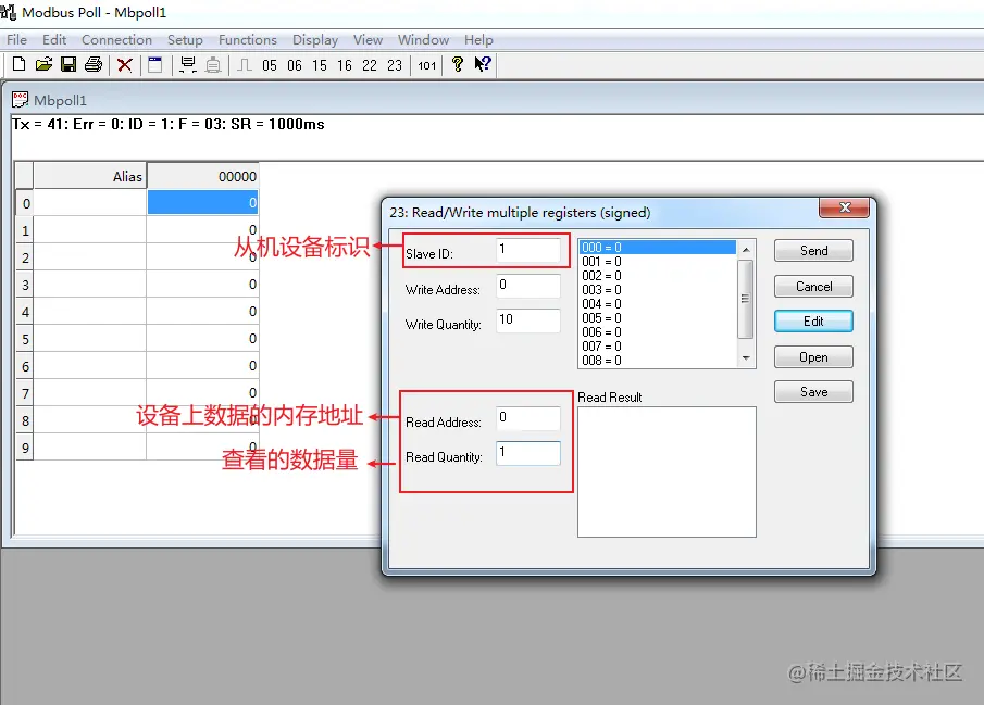 参数3:quantity,线圈,要去设备中读取的数据量,参考slave配置的quantity