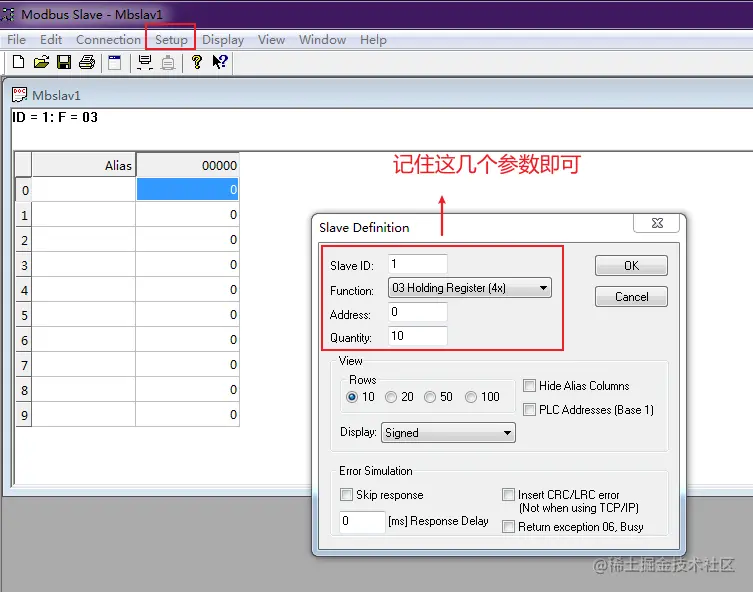 (2). 配置函数,点击setup->slave definition,弹出参数窗口,默认OK就可以。