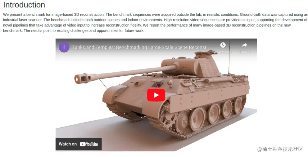 Tanks and Temples 数据集是视频数据集的3D重建。它由14个场景组成,包括“坦克”和“火车”等单个物体,以及“礼堂”和“博物馆”等大型室内场景。3D数据真值是使用高质量工业激光扫描仪捕获的。点云真值用于使用对应点的最小二乘优化来估计相机位姿。