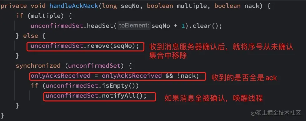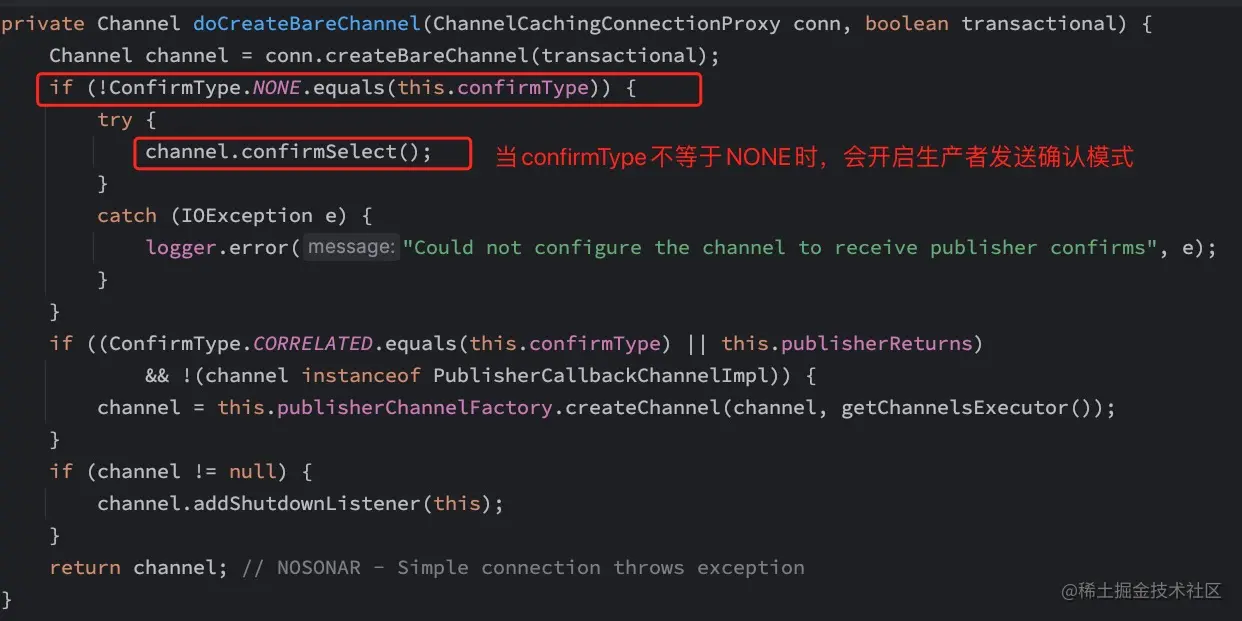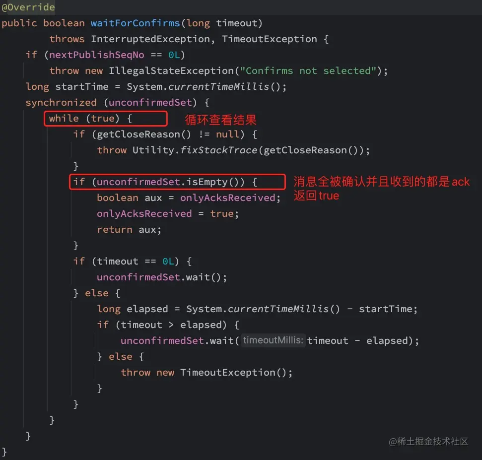 这里就可以搞明白为什么设置confirmType和callback就可以实现消息的可靠性,那么waitForConfirms又是怎么一回事呢?