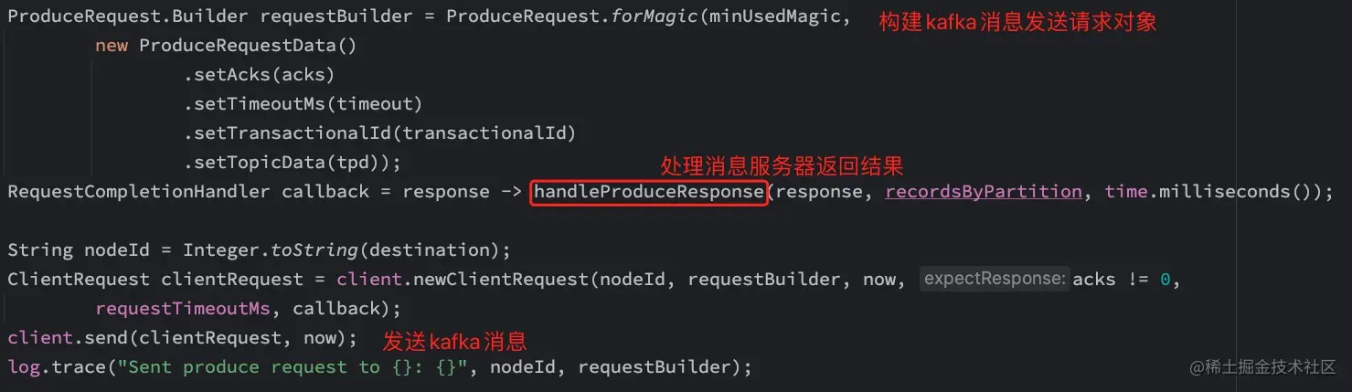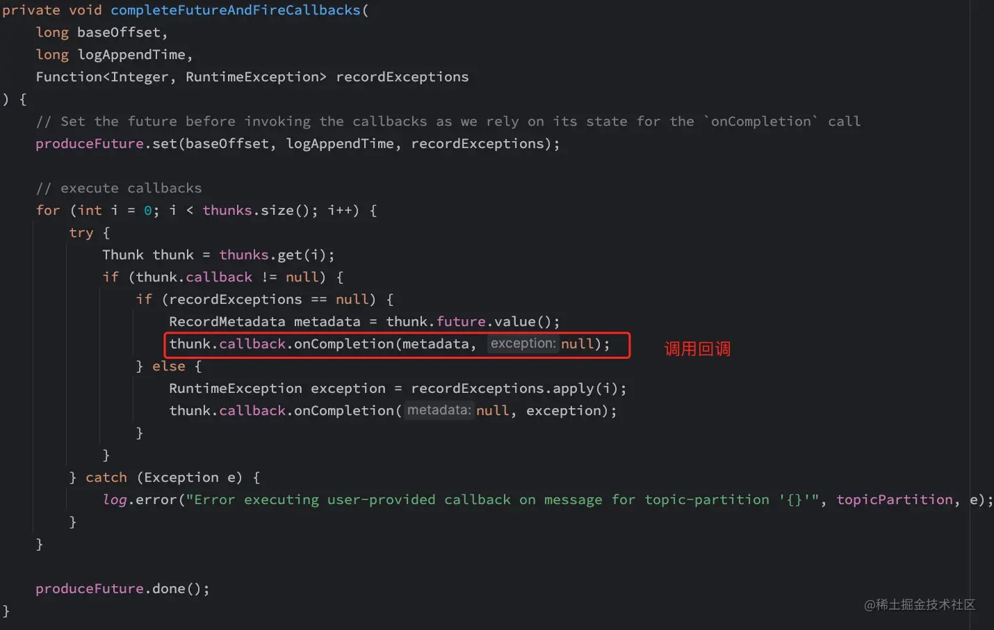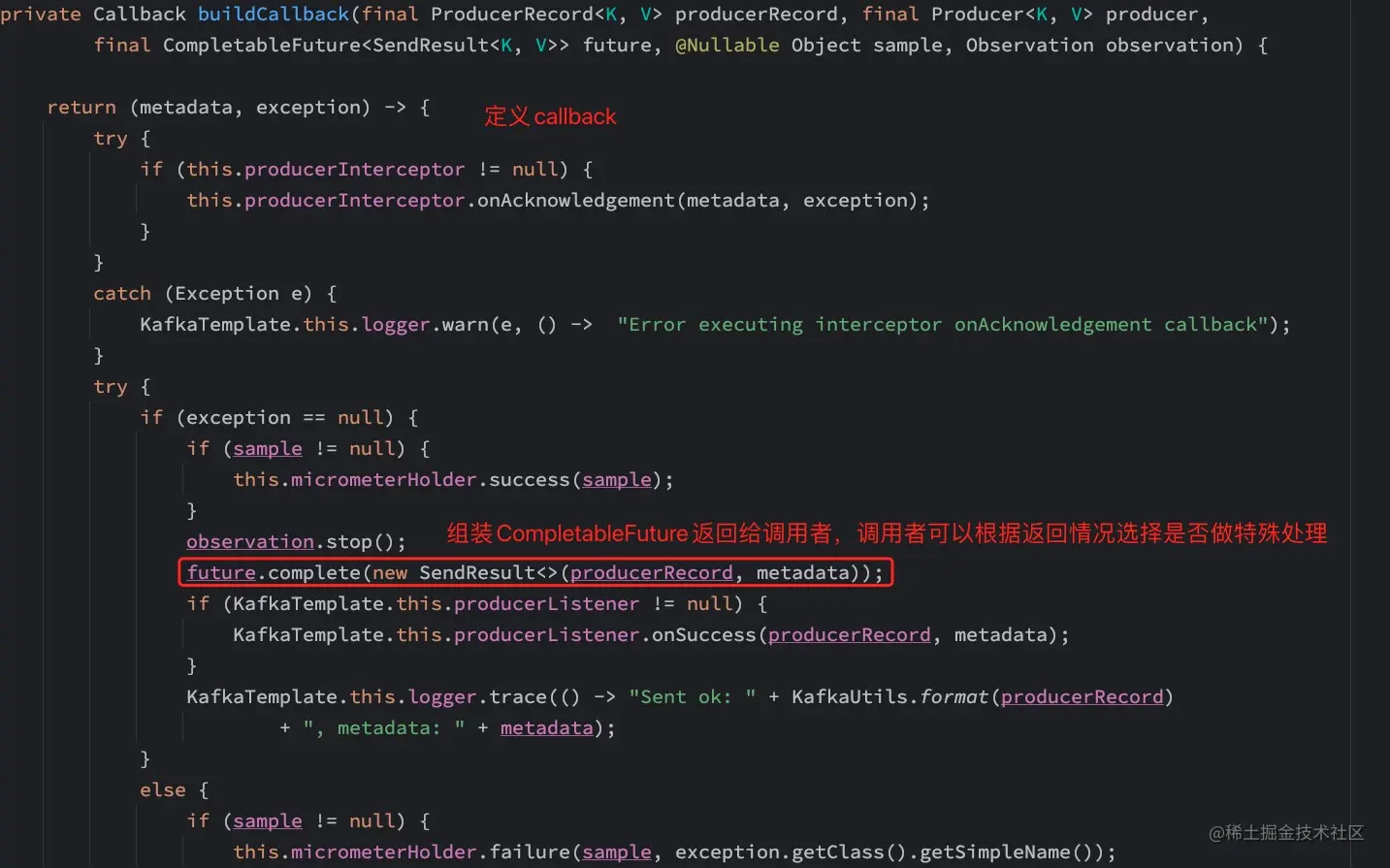 callback的定义就可以串起整个链路。当收到kafka服务器返回时,会调用callback,callback根据kafka消息服务器是否返回异常来组装CompletableFuture,调用者可以从CompletableFuture得到最终结果,如果结果正常,则无需处理;如果结果异常,可选择进行特殊处理(比如重试),从而保证消息一定发送到消息服务器。