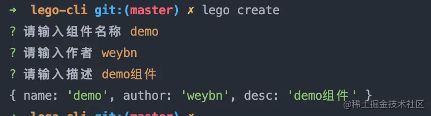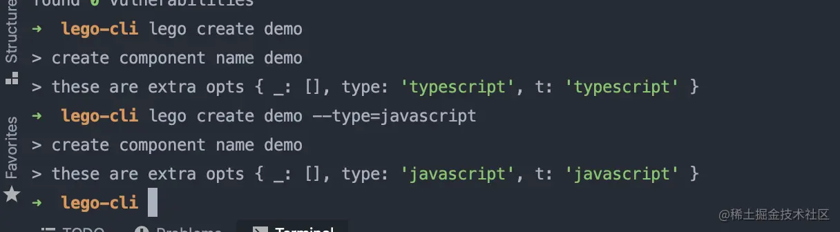 当用户在命令行中输入lego create demo --type=javascript,那么会输出: