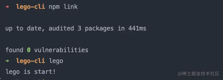 接下来输入npm link将命令链接到全局并输入lego,命令行会执行lego.js文件,此时一个简单的命令行工具就完成了!
