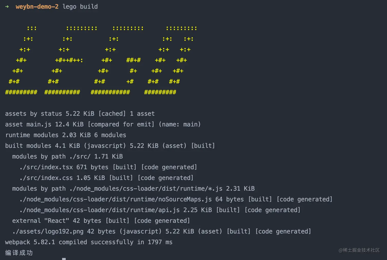 构建功能就完成了,此时无需在lego组件中安装webpack,同时lego组件也可以没有配置文件。如果有需要,我们可以在webpack基础上实现二次编译配置封装。我们在demo中运行lego build命令,可以看到以下结果: