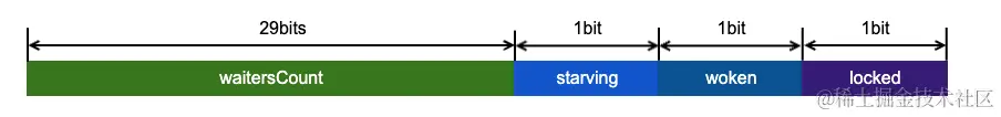 waitersCount:记录当前等待抢这把锁的goroutine数目;starving:当前锁是否处于饥饿状态;0-正常,1-饥饿;woken:当前锁是否有被唤醒;0-没有,1-有;locked:当前锁是否被持有;0-没有,1-有;