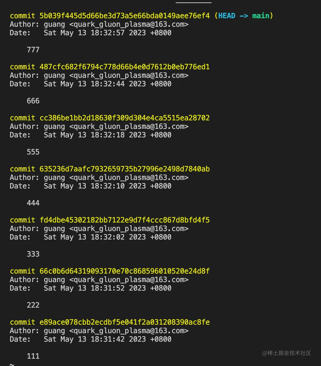 我们 git bisect reset 结束查找过程,commit 会回到原来的 777: