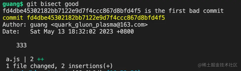 通过一步步的二分查找,最终定位到了第一个出错的 commit。