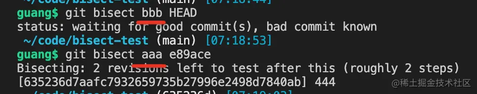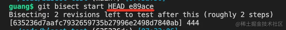 这里我加了两个参数,就是指定了 bad、good 的 commit 的意思,这样就可以直接开始二分了。