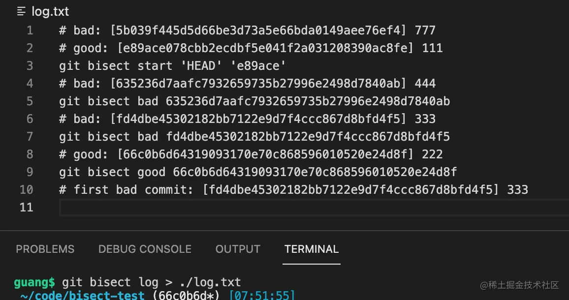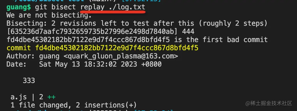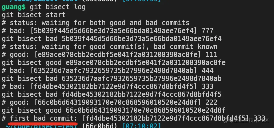 我们可以执行 git bisect log 回顾下整个查找过程:
