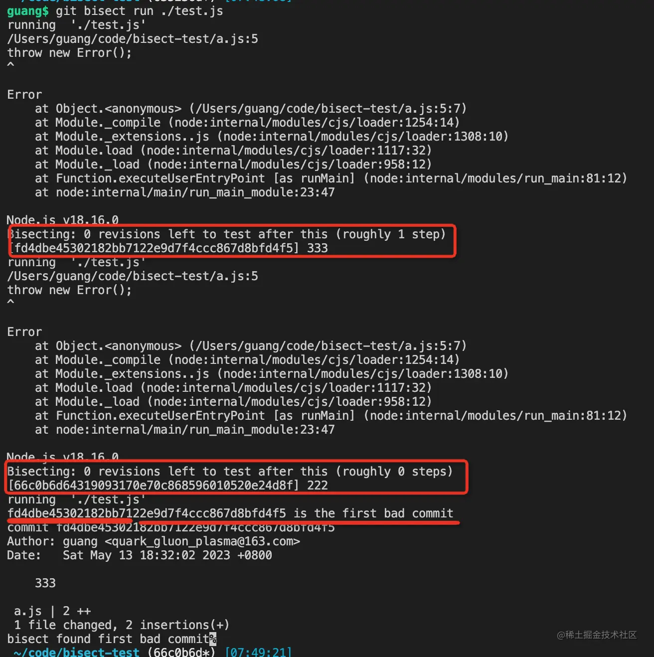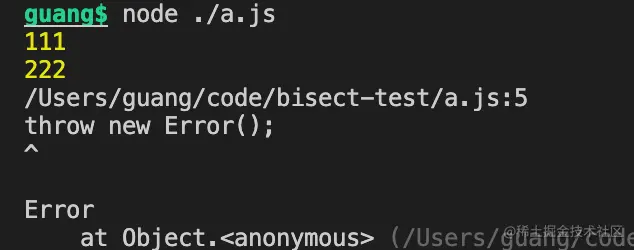 可以看到,444 跑脚本报错了,然后回到 333 跑, 还是报错,然后去 222 跑,这是不报错了,就定位到了第一个出错的是 333 这个 commit。