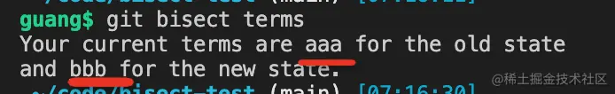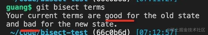 这时候 git bisect terms 可以看到确实标记变了: