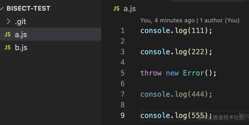 git init 初始化,然后新建 a.js,里面每一行提交一个 commit: