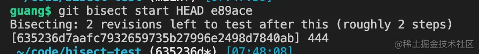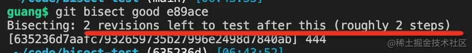 这时候提示你还有 2 个 commit 要测试,也就是还有 2 步。